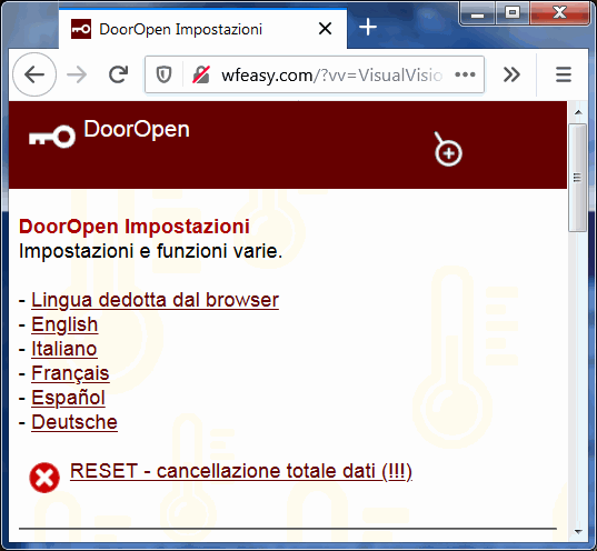 Collegandosi al wifi di DoorOpen (che si chiama wfeasy.com - si può ovviamente cambiare la password di collegamento tramite un menù di servizio protetto, quella standard è visualvision) e chiedendo il sito 10.10.10.1 oppure wfeasy.com con un qualsiasi browser Internet (es. Safari Chrome Firefox ecc.) compare la pagina principale come sotto.